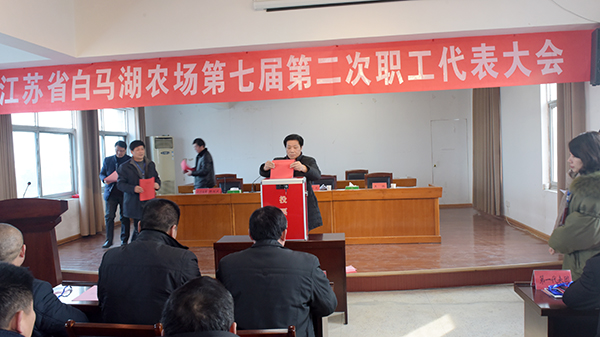在大會(huì)預(yù)備會(huì)議通報(bào)參會(huì)人數(shù)、通過(guò)大會(huì)議程后,大會(huì)在莊嚴(yán)的國(guó)歌聲中宣告開幕,黨委書記、場(chǎng)長(zhǎng)姚春華作了《關(guān)于江蘇省國(guó)營(yíng)白馬湖農(nóng)場(chǎng)公司制改革方案的說(shuō)明》,明確了改革的目的和在國(guó)有資產(chǎn)處置、法人治理結(jié)構(gòu)、組織領(lǐng)導(dǎo)、進(jìn)度安排等方面的具體要求和措施,有效地提高了代表們對(duì)農(nóng)場(chǎng)公司制改革的認(rèn)識(shí)和認(rèn)同。接著,大會(huì)又以舉手表決的形式,通過(guò)了職工董事、職工監(jiān)事選舉辦法,還按照規(guī)定程序和選舉辦法,分別通過(guò)票決、投票選舉和職工代表分別簽字等形式,順利通過(guò)了《關(guān)于江蘇省國(guó)營(yíng)白馬湖農(nóng)場(chǎng)公司制改革方案的決議》,選舉產(chǎn)生了一名職工董事和一名職工監(jiān)事。黨委副書記韓正光宣讀了大會(huì)決議,宣告農(nóng)場(chǎng)公司制改革方案順利獲得通過(guò)。