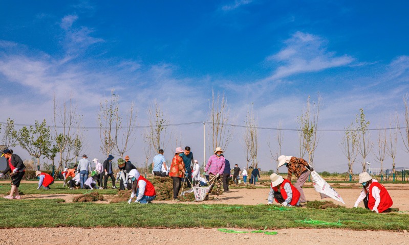 “草皮之間要留有空隙,讓它的根可以生長,大家鋪的時候注意一些。”“這邊的草皮馬上就要鋪完了,快讓運(yùn)送車再裝一車草皮過來。”……