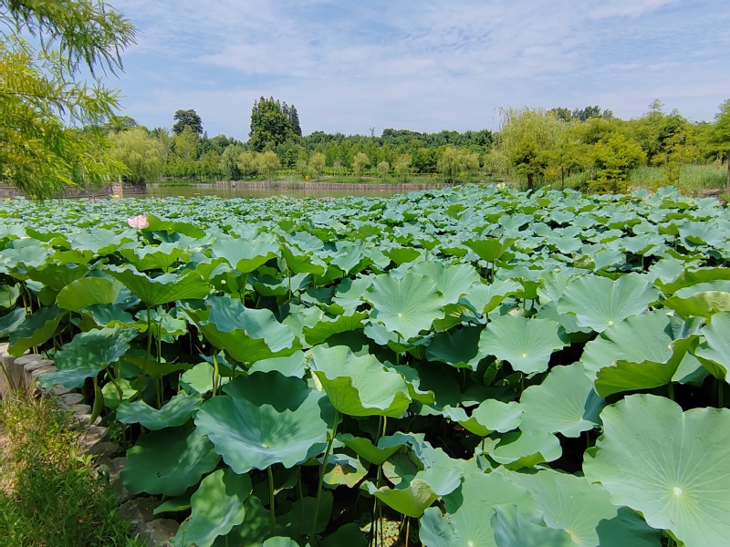 隨著氣溫持續(xù)升高,公園內(nèi)的荷花競相開放,荷葉碧翠欲滴,展現(xiàn)了一副接天蓮葉無窮碧,映日荷花別樣紅的魅力畫卷,讓人感受到一絲絲涼意。周邊居民陳先生說:“有了荷花,這里的夏天更加漂亮了”。湖邊是垂柳依依,隨風浮動。荷葉一個接著一個鋪了滿塘,有的盛著晶瑩剔透的水珠,不禁想起小時候不懂事,會把荷葉折下來,拿在手中轉(zhuǎn)圈圈。