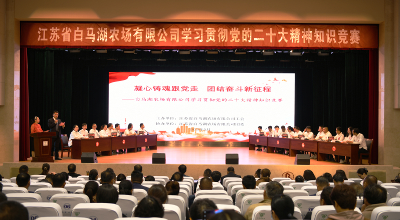 5月5日,白馬湖農(nóng)場(chǎng)公司“凝心鑄魂跟黨走 團(tuán)結(jié)奮斗新征程”學(xué)習(xí)貫徹黨的二十大精神知識(shí)競(jìng)賽在職工禮堂火熱開賽。黨委書記、董事長(zhǎng)韓正光,黨委副書記、總經(jīng)理韓樹明,副總經(jīng)理衡愛(ài)軍,紀(jì)委負(fù)責(zé)人時(shí)奎敬,第二片區(qū)財(cái)務(wù)總監(jiān)奚興林出席競(jìng)賽。來(lái)自機(jī)關(guān)和各單位的21支代表隊(duì)共計(jì)63人參加競(jìng)賽。