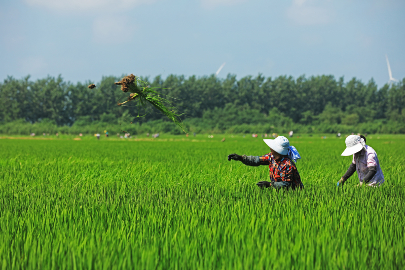 蘇墾農(nóng)發(fā)寶應(yīng)湖分公司擁有3500畝有機(jī)稻生產(chǎn)基地,該基地于2021年取得歐盟、國(guó)環(huán)雙認(rèn)證。為保障有機(jī)稻質(zhì)量,每到夏季,公司都會(huì)組織進(jìn)行人工拔“雜草稻”。高溫炙烤下,200多名勞動(dòng)者揮汗如雨,為生產(chǎn)出“魚米之鄉(xiāng)”高質(zhì)量有機(jī)米貢獻(xiàn)力量。