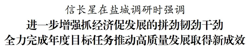 10月28日,省委書記信長星到鹽城市鹽都區、東臺市調研。他強調,四季度是全年決勝階段,要深入學習貫徹習近平總書記重要講話精神,錨定年度目標任務,堅定信心、把握機遇,進一步增強抓經濟、促發展的拼勁、韌勁、干勁,推動高質量發展取得新成效,努力為全省發展大局貢獻更大力量。