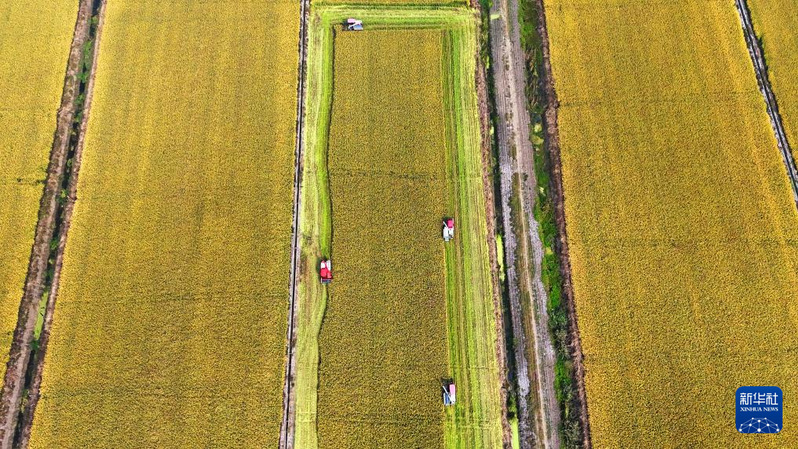 江蘇省連云港市海州區(qū)崗埠農場工作人員在搶收水稻(無人機照片)。新華社發(fā)(耿玉和 攝)
