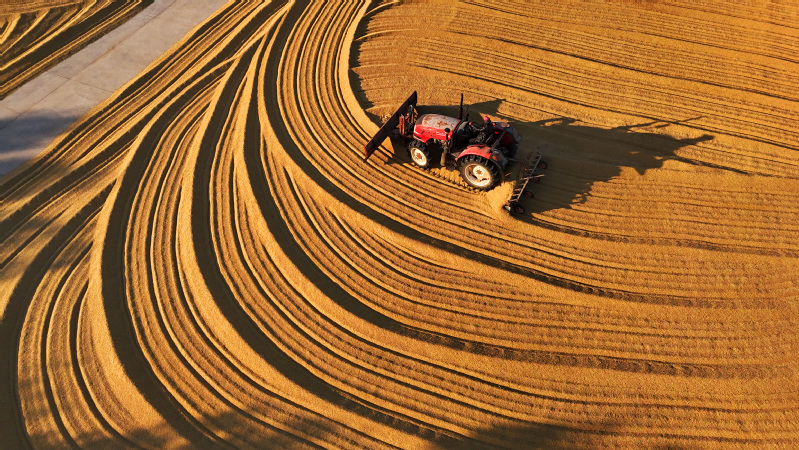 江蘇省連云港市海州區(qū)云臺農場工作人員搶抓晴好天氣翻曬稻谷(10月28日攝,無人機照片)。“新筑場泥鏡面平,家家打稻趁霜晴。”金秋時節(jié),各地迎來豐收季,農民抓住晴好天氣收割收獲晾曬谷類作物,田間地頭呈現(xiàn)一派忙碌的豐收景象。新華社發(fā) 耿玉和 攝