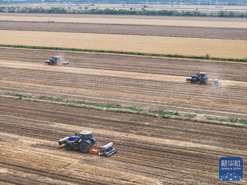 5月28日,揚州大學(xué)研制的“九合一”稻麥耕播機在三河農(nóng)場播稻種(無人機照片)。新華社記者 季春鵬 攝