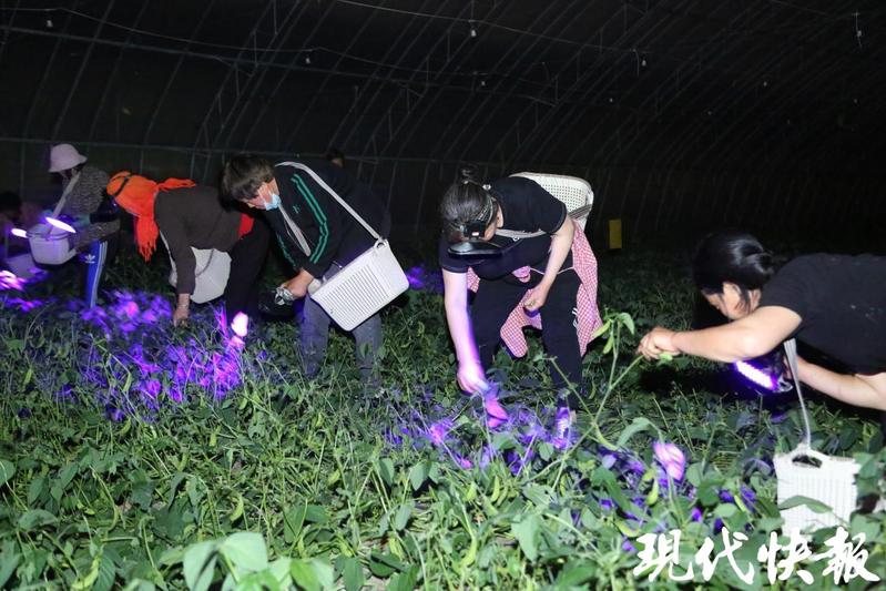 “搜尋時一定要仔細,左右兩邊都得留意,才能把豆丹抓全。”單體2號大棚的豆丹養殖負責人李加祥一邊熟練地捕捉豆丹,一邊向工作人員傳授經驗,“豆丹和豆葉顏色相近,白天捕捉極易遺漏。但到了夜間,紫光燈一照,豆丹就像會發光的螢火蟲,清晰可見,不僅抓捕效率高,還能做到顆粒歸倉。”為確保此次捕捉行動順利開展,園區提前規劃,從人員調配到工具準備,每一個環節都精心部署,為高效捕捉打下堅實基礎。