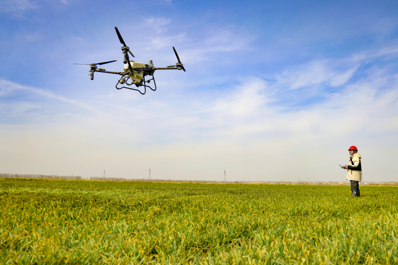 江蘇省鹽城市射陽縣,江蘇農墾新洋農場工作人員操作新型植保無人機為小麥噴施葉面肥。