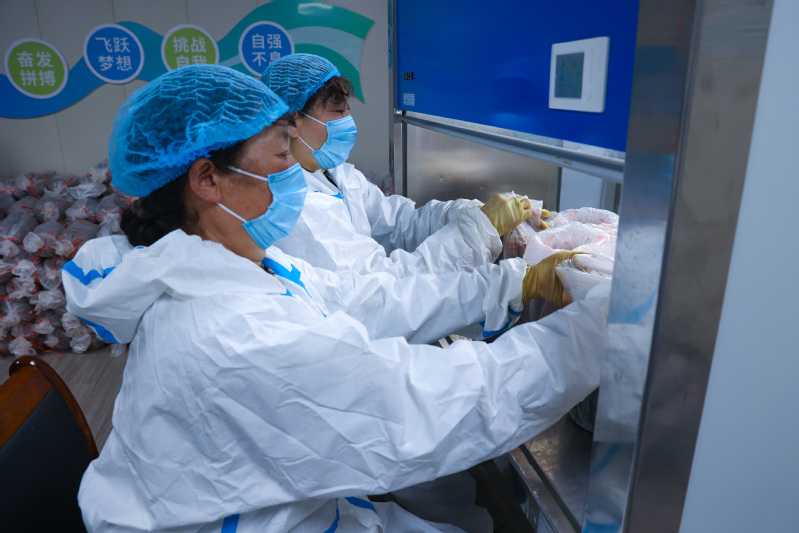 近日,在云臺農場興墾科技工作室內,工作人員正在進行靈芝接種工作。整個接種過程在嚴格的無菌環境下進行,工作人員將靈芝菌種小心地放入椴木孔洞中,為靈芝生長創造良好的條件。據悉,本次接種工作將處理15000個菌棒,菌絲發滿后將進行定植工作。